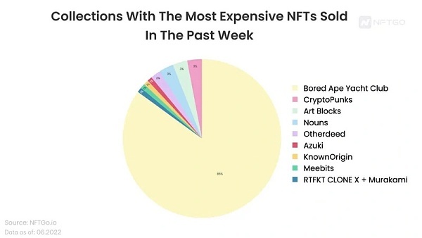 可以看出 BAYC 在 NFT 交易榜中是占比最大的。在过去一周中,超过 85% 的高价交易都来自 BAYC。排在 BAYC 之后的是