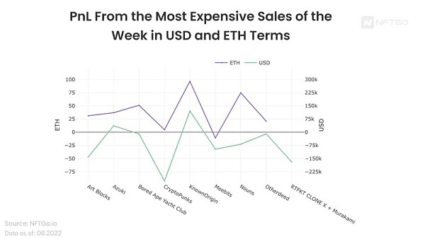 ETH 价格下跌对市场估值的影响,我们又绘制了 ETH 和美元计价的利润和损失表(PnL),计算方法是将卖出价减去买入价。