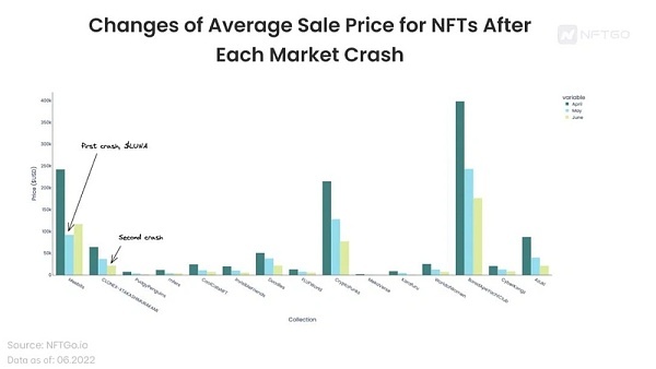 市场情绪变冷极大影响了 NFT 的平均价格。之前在最狂热的阶段,一些蓝筹 NFT 的估值达到最高点。而此后这些估值持续暴跌,陷入了冷却周期。