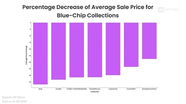 在 NFT 市场的成交量上,蓝筹 NFT 一直占有主要优势,而现在部分蓝筹 NFT 已经在以亏损价格被交易。NFTGo