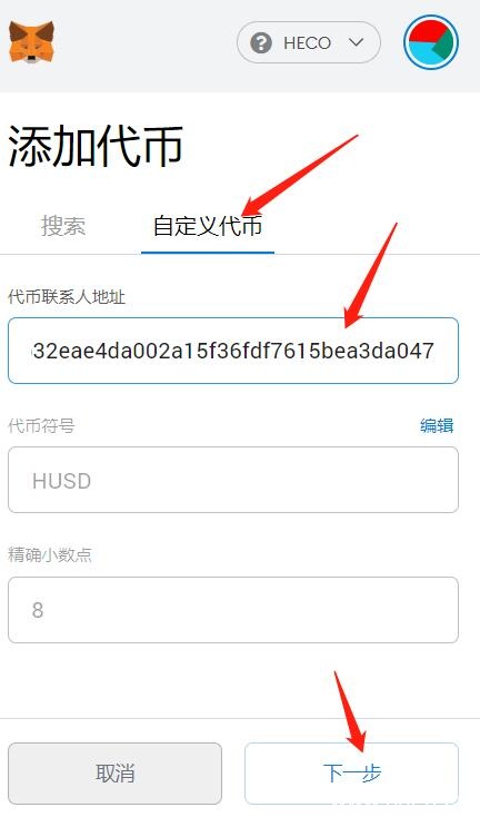 3.添加合约地址:以HUSD为例:0x0298c2b32eae4da002a15f36fdf7615bea3da047