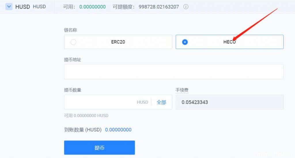 5.在提币界面选择HECO链(注意,不要选错链,不要填错提币地址,否则可能造成资产的永久性丢失)