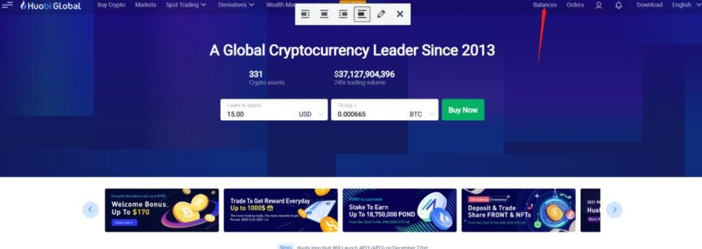 登录火币官网,点击右上角balances