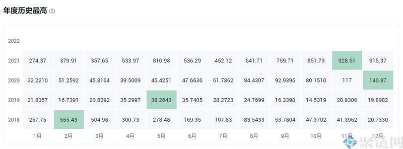 2021年11月11日DGD币出现历史最高价为931.19美元,2020年12月DGD币出现最高价为140.87美元,2019年5月DGD币出现最高价为38.2643美元,2018年2月DGD币出现最高价为555.43美元。
