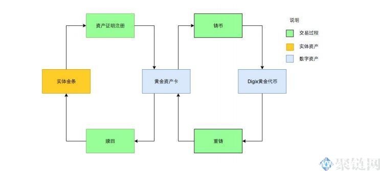 以下是DigixDAO的铸币过程:实体金条——资产证明——黄金资产卡——产生对应的Digix黄金代币,反过来,黄金代币也可以换成实体金条。