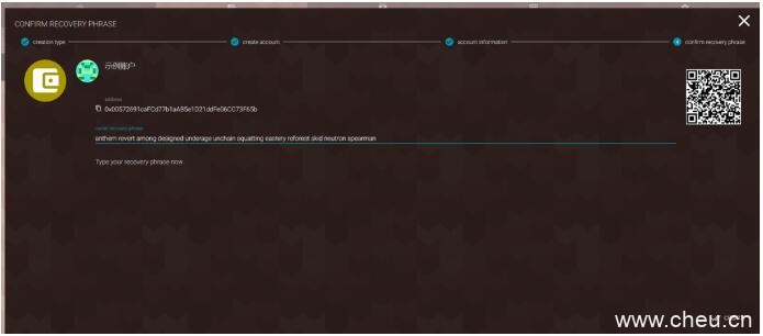 7. 手动输入保存好的账户恢复密语,点击右下角的“Create”创建账户。