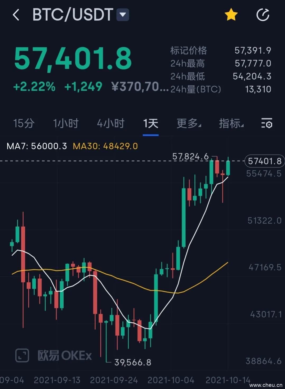 最近,比特币开启了独立上涨模式,在其他加密货币整体保持平稳震荡的情况下,比特币大幅上涨,先是在10月6日,以10.44%的涨幅从49645美元涨至5.6万美元,随后连续上涨并突破57824美元高点。