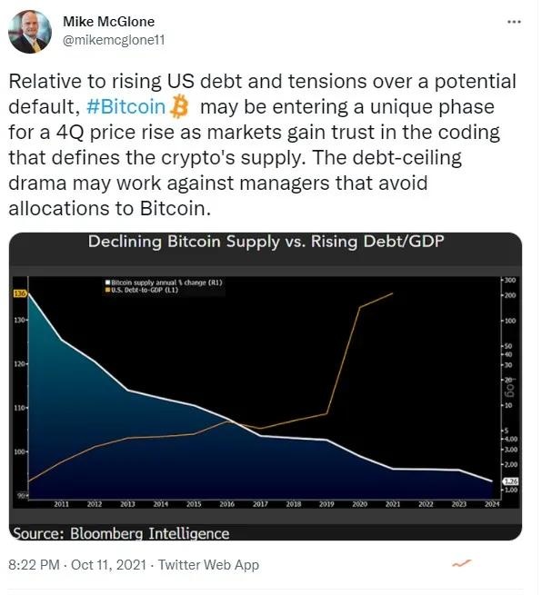 McGlone发推称,相对于不断增加的美国债务以及对违约可能性的担忧日益加剧,比特币可能正在进入一个独特的阶段,随着市场对比特币既定的有限供应量越来越信任,比特币价格将在第四季度上涨。