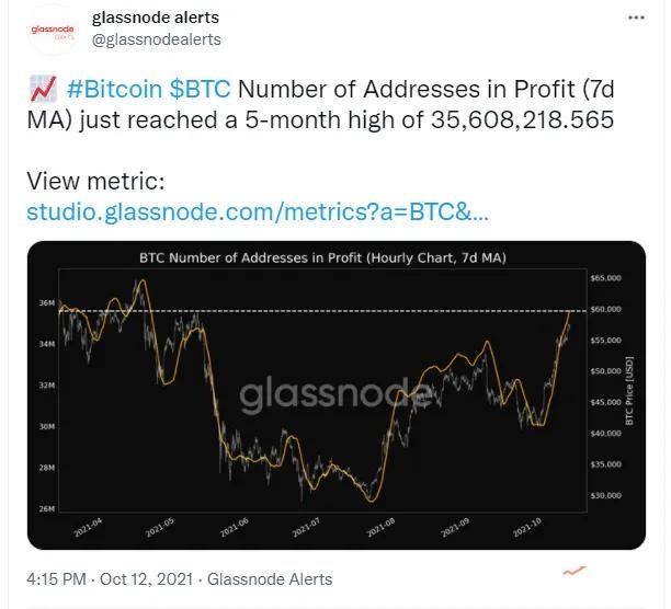 据Glassnode数据显示,BTC盈利地址数达5个月高点,7天均线数额为35,608,218.565。