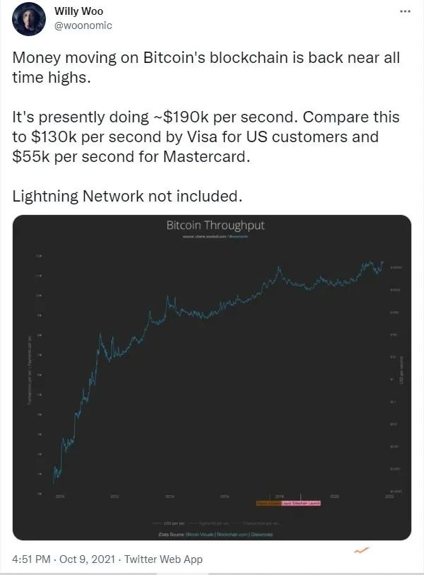 Woo近日发推称,目前比特币链上交易结算量(不包含闪电网络)超过Visa和万事达卡,为每秒19万美元,而Visa为每秒13万美元,万事达卡为每秒5.5万美元。