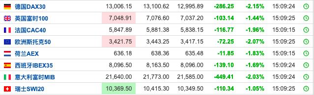 欧股开盘走低,随后跌幅扩大,德国DAX30指数跌2.15%,英国富时100指数跌1.44%,法国CAC40指数跌1.96%,欧洲Stoxx