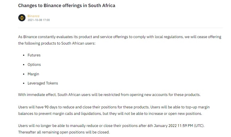 全球最大的加密货币交易所币安(Binance)8日宣布将停止向南非用户提供期货、期权、保证金和杠杆代币。币安表示停止期货、衍生品交易的原因是由于该公司会不断评估他们的产品和服务以符合当地法规。公告指出:即日起,南非用户被限制为这些产品开设新账户。用户将有90天的时间关闭这些产品的现有头寸。