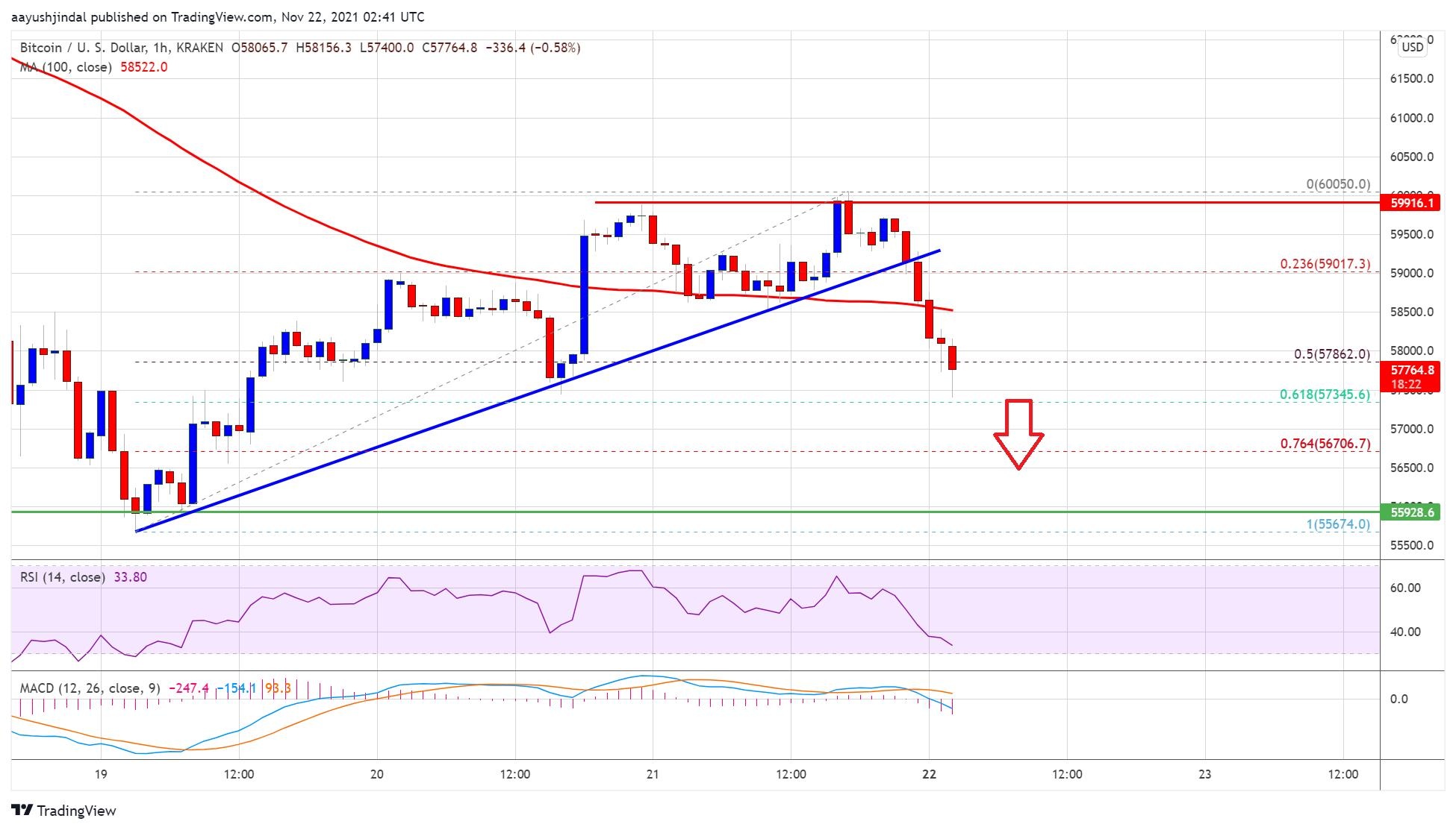 结果,价格开始新的跌破 59,200 美元的水平。价格低于 58,500 美元的支撑区域和 100 小时的简单移动平均线。此外,在 BTC/USD