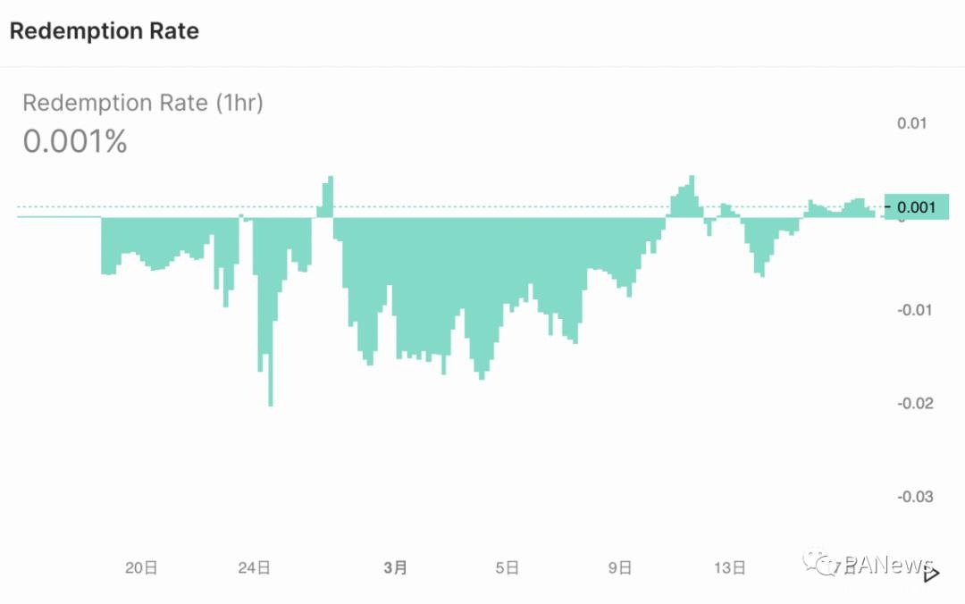 RAI不锚定任何货币,最初的赎回价从圆周率3.14开始,通过一系列参数降低波动率。从官网可以看到,RAI的赎回率基本一直维持在0附近,这是RAI赎回价与市场价之间的差值,所以近期RAI的价格并没有大幅偏离系统中的赎回价。
