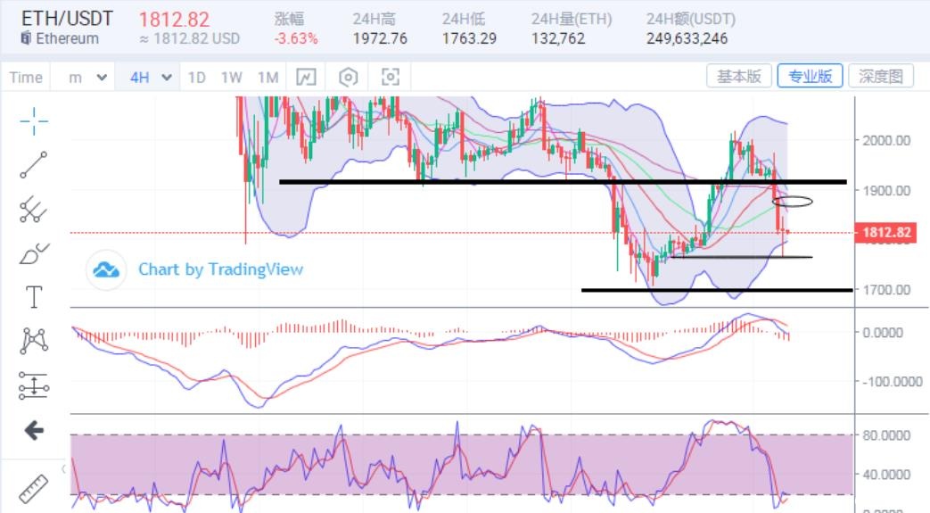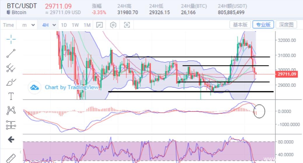 目前盘面上看,比特币下跌到中轨,而以太坊前面反弹弱现在回落下跌又到了下轨附近,既然跌了不少而早间也有反弹调整,那么日内这调整将会延续,只是这下跌放量带了节奏,盘中就会受到空头抛量影响而偏空头,所以日内短期注意反弹修复后的延续下跌情况,比特币上方压力关注30300,31000位置,下方支撑关注29300,28600位置,至于以太坊上方压力关注1860,1910位置,下方支撑关注1760,1700位置,注意行情偏空震荡节奏。