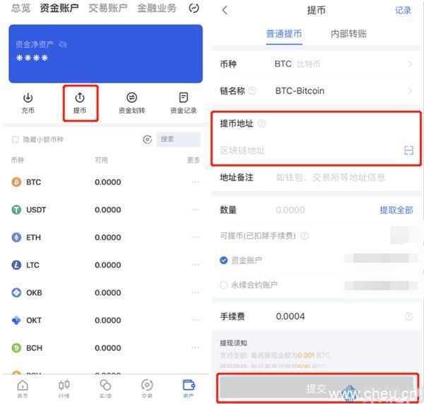 3、点击右下角资产按钮,进入资产账户页面。点击提币,选择要提币的币种,例如BTC ,填写或复制要提币的地址,填写数量提交即可。