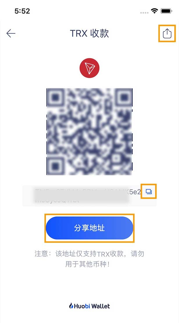3、分享收款二维码,或直接复制地址给好友,等待 TRX 到账即可。