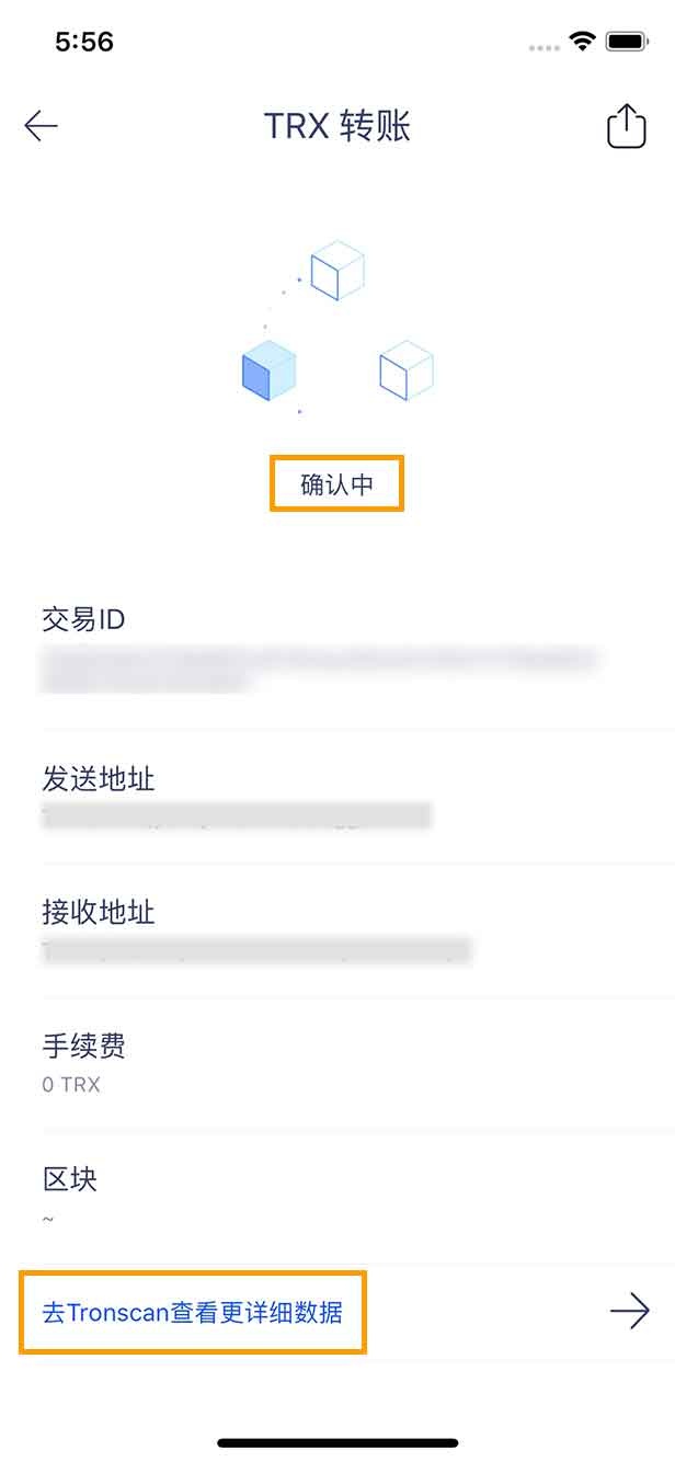 5、转账完成后,转账状态将由“确认中”变更为“TRX 转账成功”。此时,点击右上角分享按钮还可以分享转账页面给好友,便于对方及时查看转账进度;