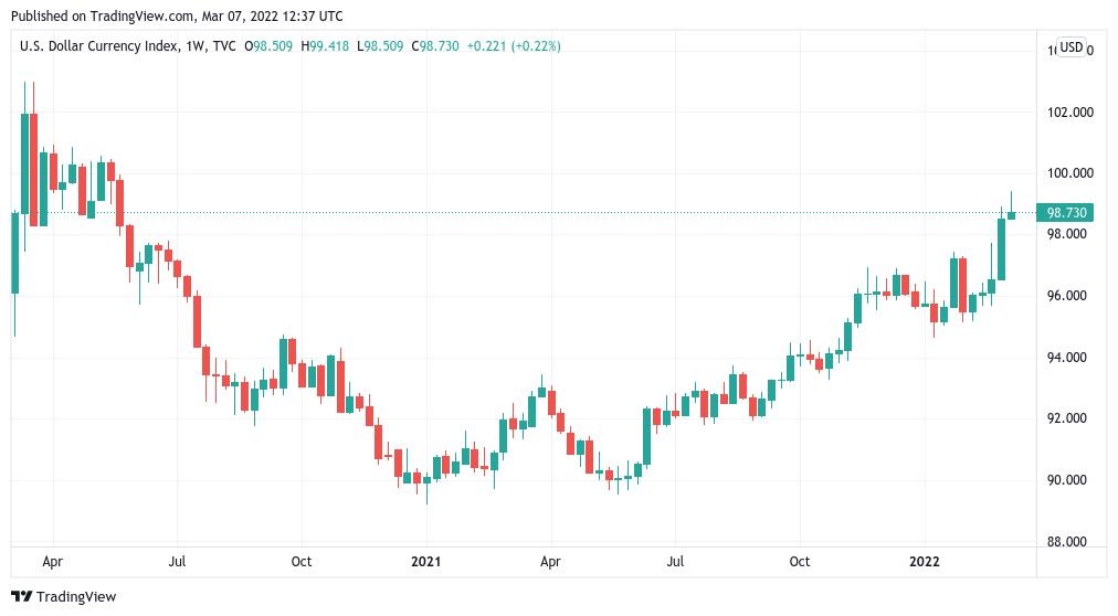 紧随其后的是美元,美元兑其他货币飙升,美元货币指数 (DXY) 目标 100 接近两年新高。