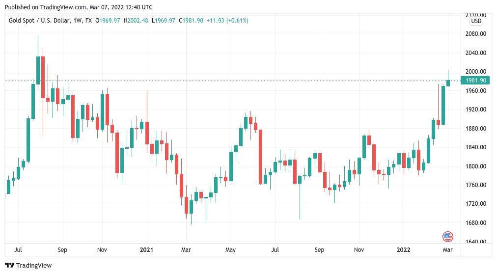 因此,本已恐慌的气氛推动了避险黄金的表现,自 2020 年 8 月以来的 3 月 7 日,黄金首次回到每盎司 2,000 美元。