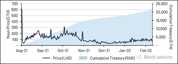 313.69 ETH,自今年年初以来每个Nouns稳定在 80 ETH 左右。该国库目前拥有超过 20k ETH(在撰写本文时约为 6000 万美元),DAO