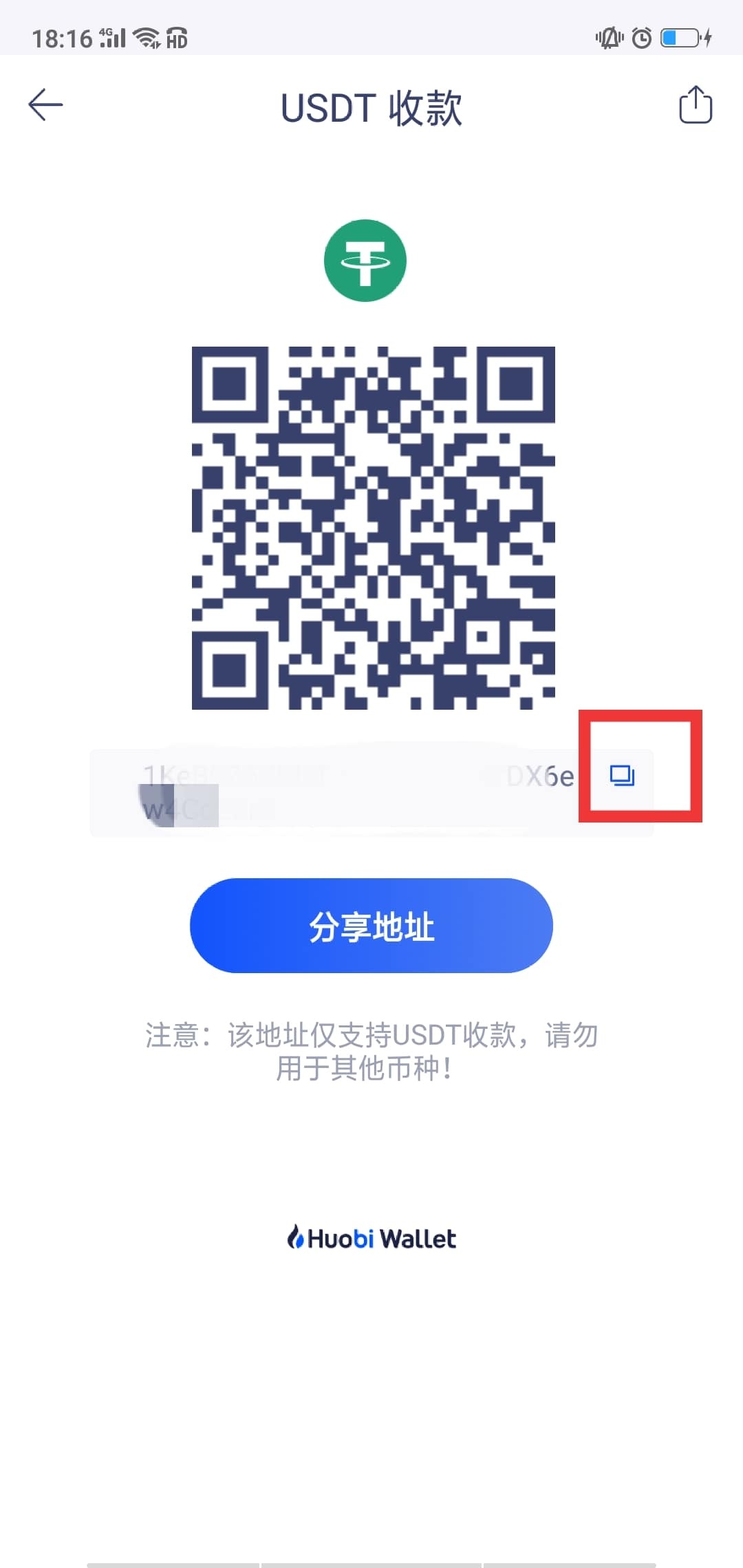 打开火币钱包,点击USDT收款页,先备份好助记词,然后点击地址复制按钮,复制完地址后填入到交易所提币地址一栏内。