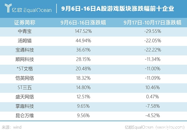 不过,9月17日之后,游戏板块这股热潮似乎有所回落。数据显示,截至10月17日,上述企业中除了ST三五和盛天网络之外,其余8家企业股价均出现下跌。其中,中青宝、汤姆猫和宝通科技分别下跌29.55%、22.05%和22.22%。