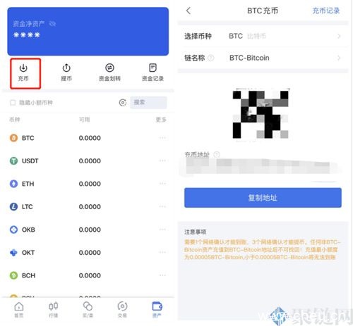 1、打开欧易OKEx APP(http://www.yuanhehe.com/yhh/ios.html),点击左下角的资产按钮,进入资金账户界面。点击充币,例如 BTC,您会得到一个充币地址,向该地址进行充值即可。