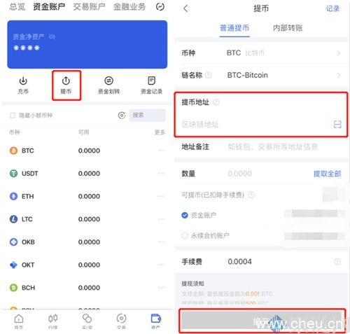 3、点击右下角资产按钮,进入资产账户页面。点击提币,选择要提币的币种,例如BTC,填写或复制要提币的地址,填写数量提交即可。