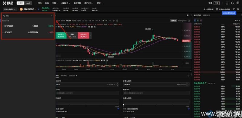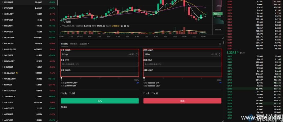 3、点击交易对后会出现交易界面,根据需求购买和交易STX币