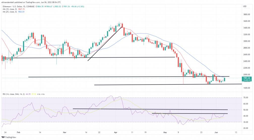 ETH也在本周开始反弹。然而,在上周的抛售之后,价格继续低于 2,000 美元。