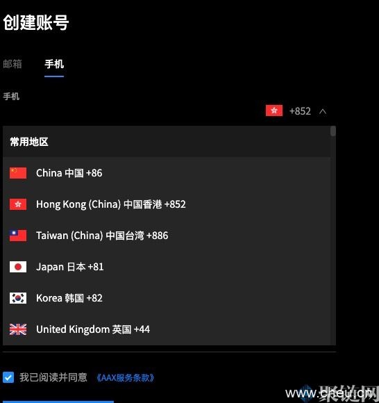 注意:若选择手机号注册,默认的代码是中国香港代码 +852 ,若要选中国代码请点击国家图片,出现下拉窗口进行手动选择。