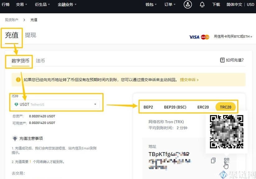 2、依次点击币安网(http://www.yuanhehe.com/yhh/ios.html (注意:国内用户目前仅支持国外邮箱注册!))顶部菜单“钱包”-“现货账户(充值&提现)”,再点击“充值”,币种选择“USDT”,右侧可以看到币安提供四种泰达币区块链网络地址:BEP2、BEP20 (BSC)、ERC20、TRC20,并且都有二维码,可以直接扫码充值或转账,如下图所示: