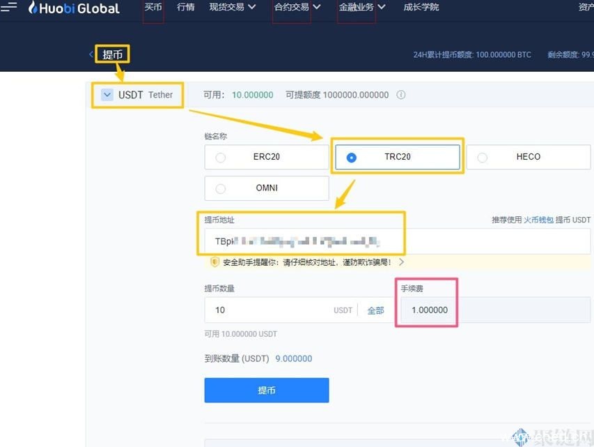 3、火币网提币(转账),依次点击火币网顶部菜单“资产”-“币币账户(充值&提币)”,再点击“提币”按钮,选择币种为USDT,“链名称”选择TRC20,并将刚才复制的提币地址粘贴到“提币地址”栏内,如下图: