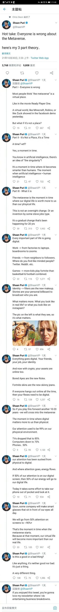 11月5日清晨,罗永浩发微博:下一个创业项目是一家“元宇宙公司”!并配有Shaan Puri在社交媒体发文的长图。