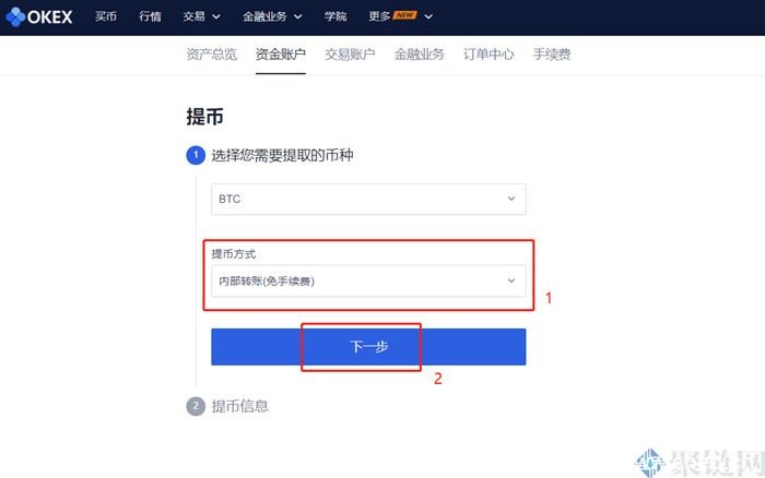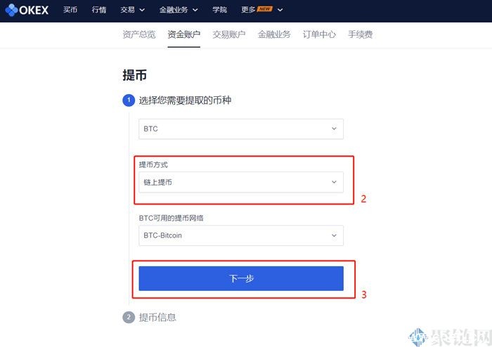 2. 选择需要提现的币种,例如BTC,选择提现方式,可以选择链上提现或内部转账,然后点击下一步。