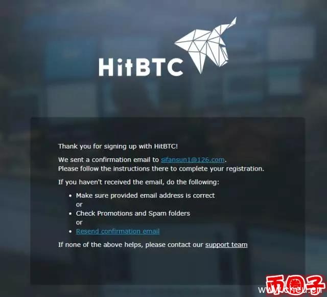 点击注册后弹出窗口通知,HitBTC您的邮箱已发送邮件,请前往核实,如未收到,可点击第二个链接再次发送: