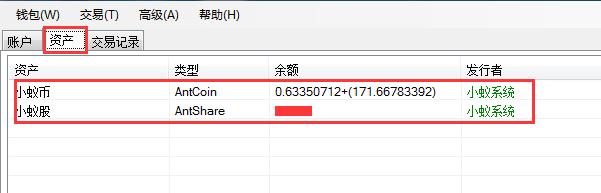 3. 完成后,可以点击资产,看到小蚁链资产,如小蚁股、小蚁币等。
