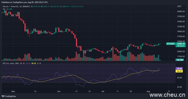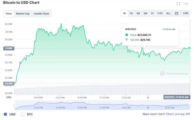 当天开始时,BTC 稳定上涨超过 23,500 美元,直至达到 24,200 美元。但无法跨越该水平,目前该代币的交易价格为 23,886 美元。撰写本文时的交易量为 $29.74 B,市值超过 $455 B。截至目前的流通供应量为 1900 万比特币。