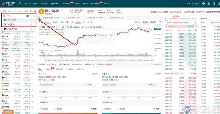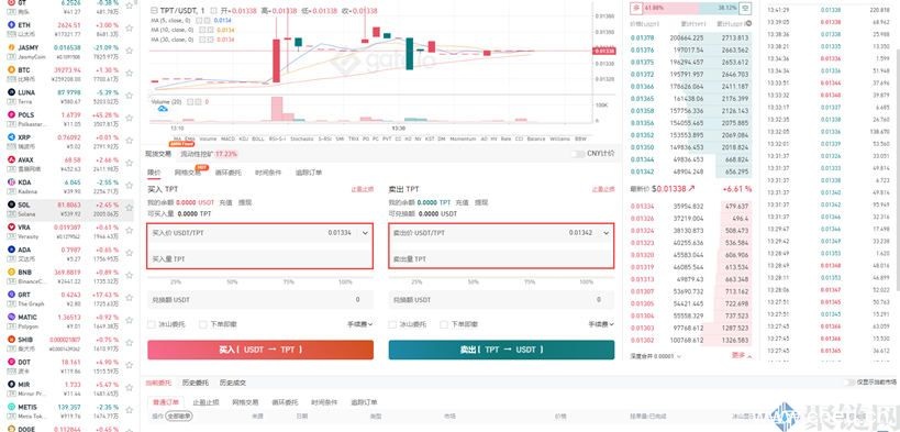 3、以TPT\USDT为例,点击后在中下方会出现交易界面,这时就可以进行交易了