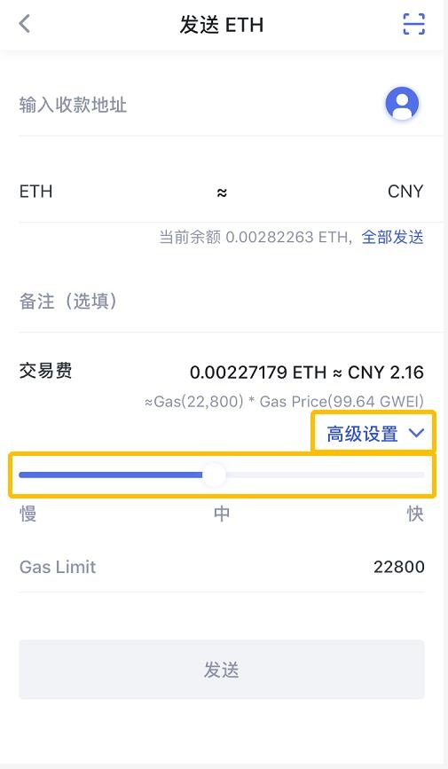 b. 转到HD钱包或者其他平台,交易费用将影响交易的确认进度,您可以根据需求调节交易费用,点击“高级设 置”,滑动滑竿调节交易费用;