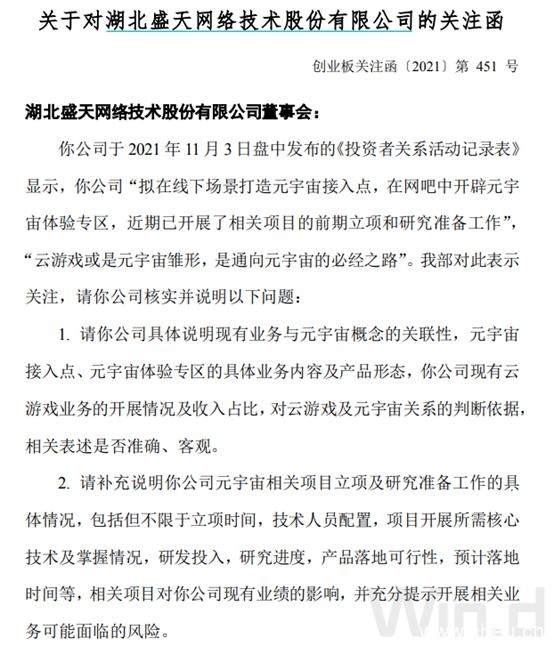 除了中青宝外,11月5日,盛天网络收关注函,要求公司具体说明现有业务与元宇宙概念的关联性,元宇宙接入点、元宇宙体验专区的具体业务内容及产品形态,公司现有云游戏业务的开展情况及收入占比,对云游戏及元宇宙关系的判断依据。