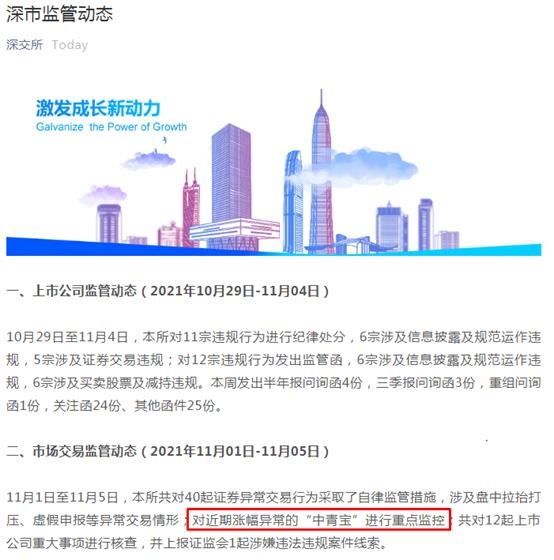 周五晚间,深交所发布监管动态称,11月1日至11月5日,本所共对40起证券异常交易行为采取了自律监管措施,涉及盘中拉抬打压、虚假申报等异常交易情形;对近期涨幅异常的“中青宝”进行重点监控;共对12起上市公司重大事项进行核查,并上报证监会1起涉嫌违法违规案件线索。