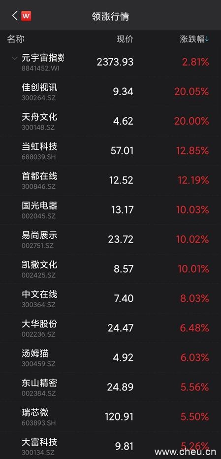 从元宇宙板块个股表现来看,佳创视讯、天舟文化、当虹科技、首都在线、国光电器、易尚展示、凯撒文化等多股涨停或涨幅超过20%。中文在线、大华股份、汤姆猫、东山精密等个股亦涨幅居前。