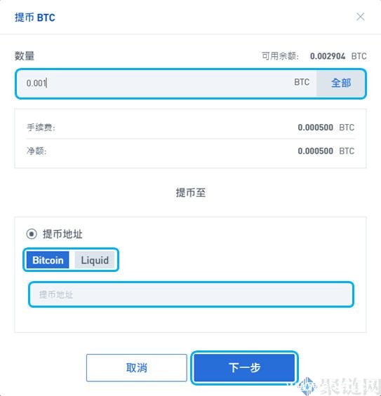 输入“金额”> 选择“区块链”> 输入“提币 (收款方) 地址”>“下一步”