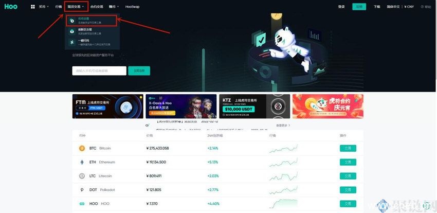 1、打开虎符交易所(hoo),点击上方的现货交易,选择币币交易