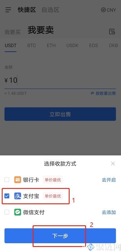 2. 选择想要的收款方式,例如支付宝,点击下一步,再点击确认出售。