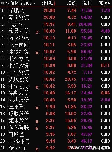 特别值得一提的是,仓储物流板块大幅飙升,新宁物流(300013)、万林物流(603117)、中铁特货、广汇物流(600603)、中储股份(600787)等近20只个股涨停。