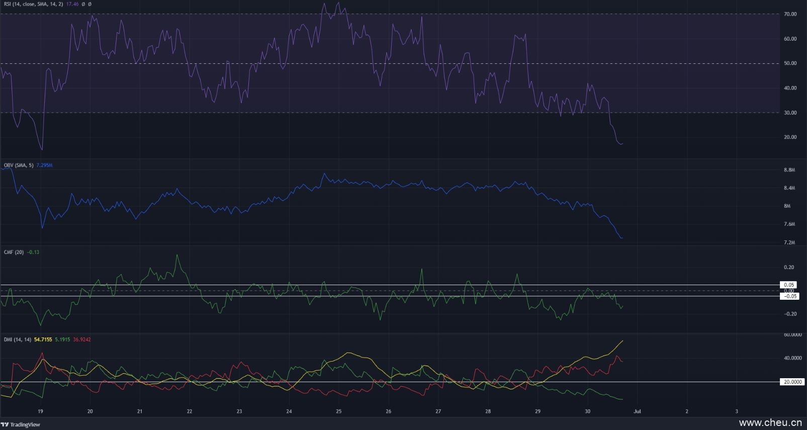 最近几天,OBV 与 CMF 一起急剧下降。他们一起在以太坊背后显示出巨大的抛售压力。DMI 也呈大幅下行趋势。ADX(黄色)和-DI(红色)均远高于