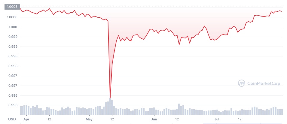 美元稳定币龙头USDT的市值随着加密市场崩盘,已从五月初旬的高点831.7亿美元,快速蒸发近170亿美元,现报约662亿美元、创下自2021年9月以来的最低水平;此外因Terra崩盘,部分投资者恐慌地退出稳定币,一度使USDT与美元短暂脱钩,价格最低曾跌至0.95美元。